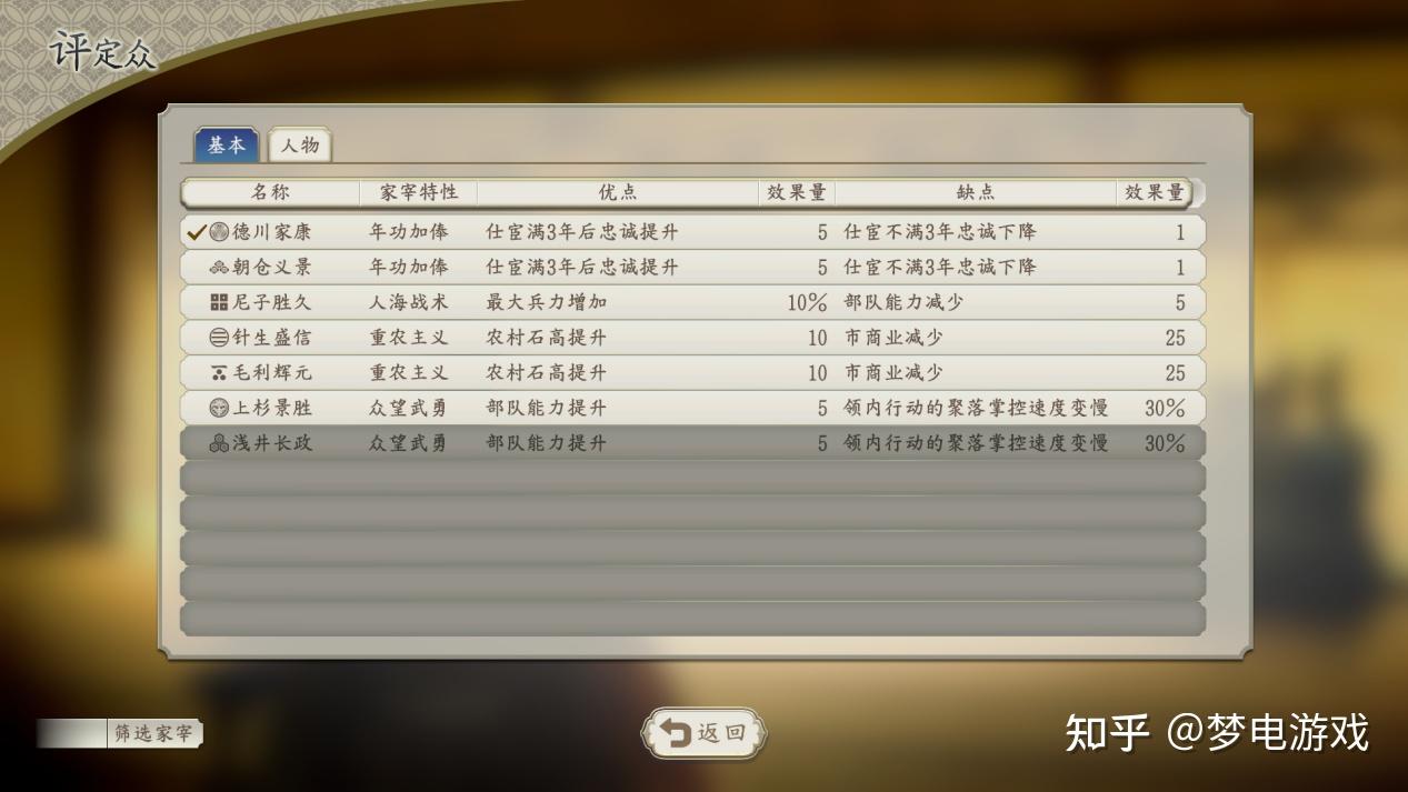 首先聊一下“评定众”系统,这是一个激活家臣(手下将领)特定功能的系统,分为家宰、外样和奉行。其中家宰必须为本家家臣,且其身份高于”家老“(简单理解为二品家臣,最高为一品),仅能安排一人。提供一个全局buff,自势力内所有领地受到影响。这个系统笔者目前一周目通关下来没有看到过仅有正面增益的特性,往往都是增加了金钱收入就会减少兵力上限之类的,其策略性体现在了不同时期使用不同家宰的选择方向上。