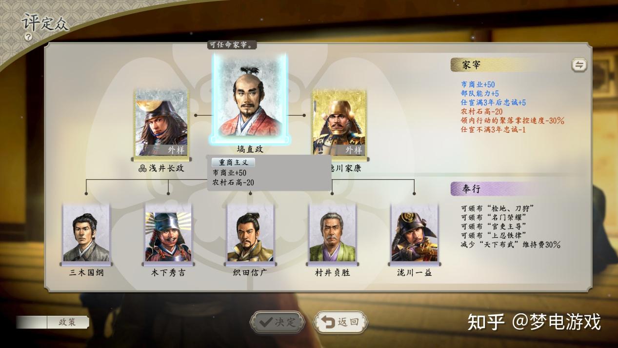 而外样则必须由从属于你的分家(被你打服了,宣誓效忠于你)的家主提供,效果同家宰,最多两名,只能选择分家家主,并不能从分家家中再挑选其身份高于家老的家臣了,颇有些中世纪俗语”你附庸的附庸不是你的附庸“的意味。而奉行则是专门用于提供各种政策解锁、政策维持费用降低功能,最多五名本家家臣出任,初始仅有一席,后续席位的开放需要研究特定”政策“并消耗金钱开放。