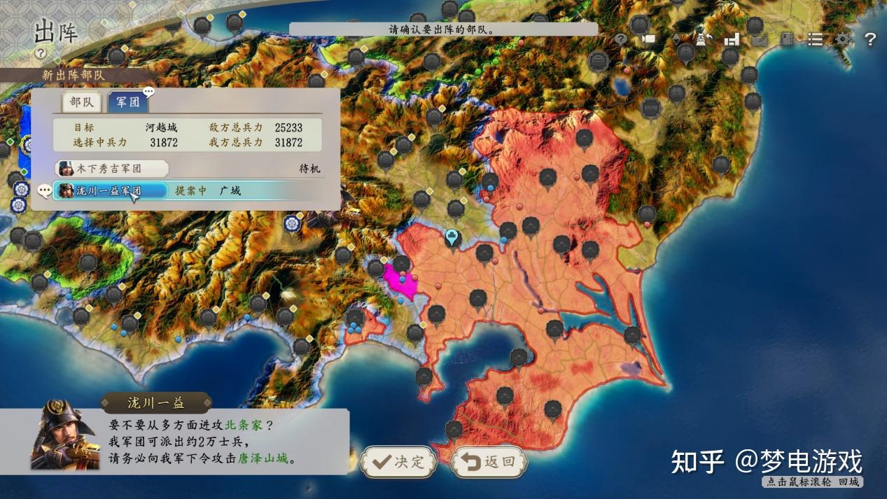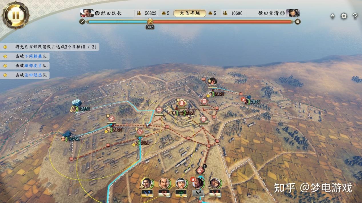 而“攻城战”作为对原版“会战”玩法的补充,其实就是针对各个城池地形设计了相应的实操战场可供玩家实际去打会战。从信野14代“创造”开始,开发组对会战这一系统就比较执着了,作为一个SLG游戏中唯一考验微操的小型战场模拟,玩家的选择其实十分的有限。会战系统的核心三要素就是:兵力、总士气、撤退点。兵力很好理解,而总士气是一个由多因素共同影响的胜利进度条,一方满了就宣告另一方的战败。士气可以通过占领据点、击溃敌军部队、摧毁敌军撤退点来获得,反之亦反。撤退点大概就是大本营,都被打掉就直接判负了。