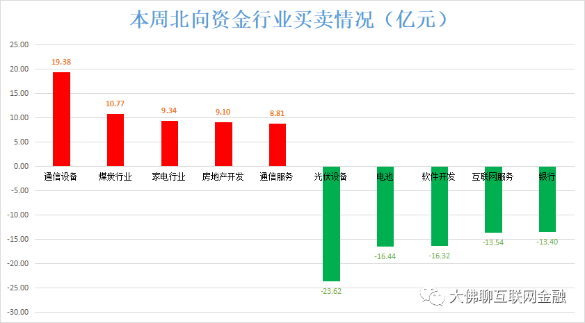 本周北向资金增持了49个行业,增持居前的行业是通信设备、煤炭行业、家电行业、房地产开发、通信服务,分别净流入19.38亿元、10.77亿元、9.34亿元、9.1亿元、8.81亿元;相反,减持了37个行业,减持居前的行业是光伏设备、电池、软件开发、互联网服务、银行,分别净流出23.62亿元、16.44亿元、16.32亿元、13.54亿元、13.4亿元。