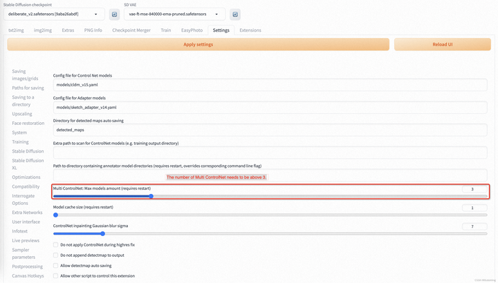 - 此外,我们至少需要三个 Controlnets 用于推理。因此,您需要设置 Multi ControlNet: Max models amount (requires restart)。