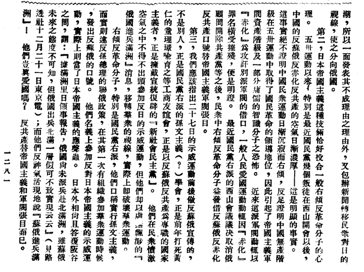 1925年12月,日军出兵阻止郭松龄进攻张作霖,这激起了全国人民的极大愤慨。在CCP的推动和带领下,北京掀起了反日进兵运动。国家主义派为蹭热度,便提出“反日俄进军东省”的伪命题以对抗之,实则不过造谣以蹭热度而已。后来成为中托少数派领袖的郑超麟曾撰文批驳之: