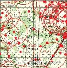 数以百计的村庄被轰炸的例子可以从数据库中得知,这与基辛格的说法截然相反。“事后”地图显示,1972 年11 月7日至1973 年8 月14日期间, 6,418吨炸弹摧毁了金边西南部干丹省的村庄。黑点代表小屋,红点是轰炸点,红圈是被B-52地毯式轰炸的投弹区域。