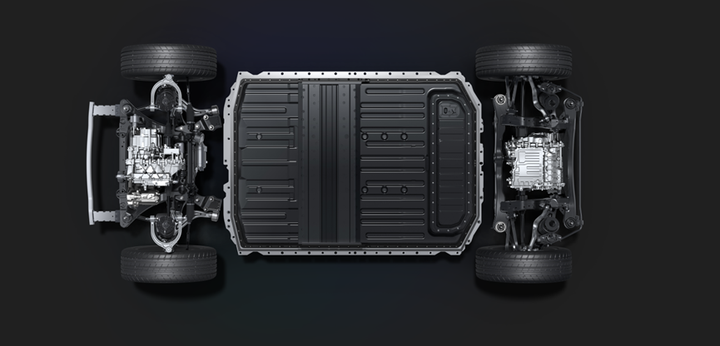 再如中置电机。正常情况下,电机都是布置在轴距之外,例如蔚来汽车的底盘平台如下图: