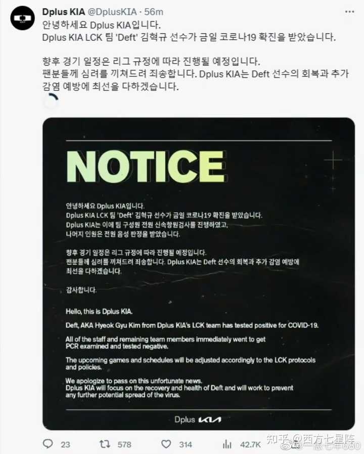 刚看到b站有一条dk战队3人新冠确诊的消息,去微博看了下,还真的是。dk是韩国英雄联盟战队,此前在6月15号,队伍的明星选手deft已经阳过了,这次是监督,教练和选手共计3人中招。另外韩国近期新冠阳性人数在快速增加中。