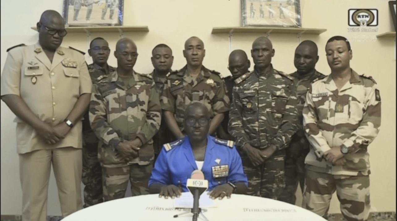 万万预料不到的是,超级反转宇宙随即发生。27日上午,尼日尔军方高层突然在国家电视台新闻发布会上齐聚一堂(熟悉的场景),以空军发言人Amadou Abdramane(下图蓝色制服)居中讲话,宣读了以总参谋长Abdou Sidikou Issa名义签字的文件,直播宣布支持政变!理由是什么为了打破政治僵局、维持国家稳定、避免流血、“保证和平的权力转移”等等,政变就这样离奇地以齐亚尼的胜利告终。。。因为尼日尔没人上网,关注此事件强度最高的尼日利亚人(尼日尔是尼日利亚的北方邻国,在反恐战争中显得关键)纷纷炸锅,表示你们开什么玩笑啊???相信所有人都有疑问,26日-27日总统府被包围的24小时内究竟发生了什么?还是那句话,可靠消息就到这里为止了,亚非利加大陆信息黑洞所言非虚,后人可能永远不知道,也很难有足够兴趣弄清楚其中真相。