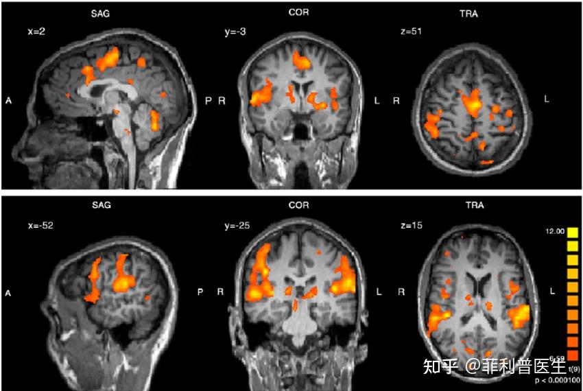 磁共振还有一个最大的好处,就是丰富的扫描序列,可以透露出组织内部更加丰富的细节,甚至可以识别出精细解剖结构、炎症、水肿、组织微观损伤、血液灌注和血管造影。甚至可以通过检测大脑活不同部位血氧水平变化来间接得到哪个脑区正处于活跃状态,从而追踪一个人的情绪、记忆、支配肢体等多种大脑活动,也被称为功能磁共振(fMRI)。
