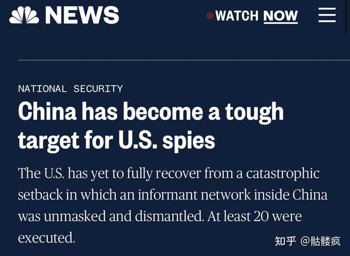 如上图标题,美国NBC报道说,中国是美国间谍难啃的骨头。副标题说CIA至今还没从最近的中国致命打击中恢复,大量窝点被发现和捣毁。至少20名CIA间谍被逮捕。
