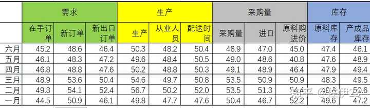 从这里我们就可以理解两个问题:(1)为什么说50这个值是荣枯线。以生产指数为例,高于50,说明生产扩大的企业比缩小的企业要多,反之亦然。(2)PMI本质是一个环比意义上的数据,是相对于上一个月的自身变化。