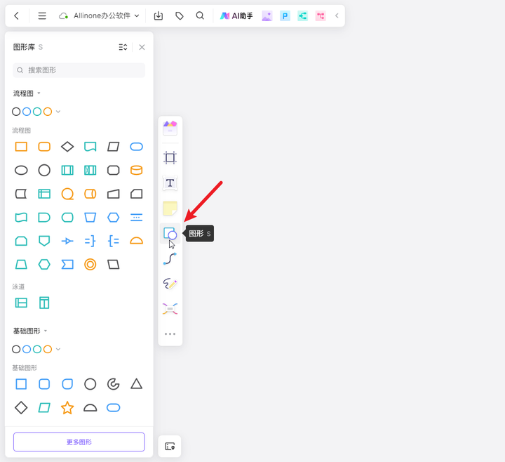 点击 boardmix白板文件左侧菜单栏的「图形」工具,打开图形库面板,在其中就能看到绘制流程图常用的形状或符号。