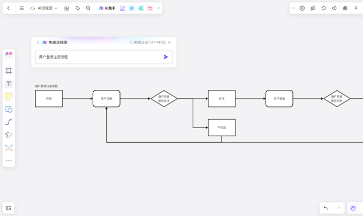 *AI流程图软件boardmix 单击推荐案例的「用户登录注册流程」,boardmix AI自动生成了下图所示的流程图,一句话生成流程图,就是这么简单: