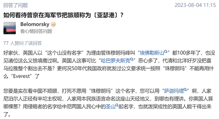 好家伙,英国人以“这个山没有名字”为理由管珠穆朗玛峰叫“埃佛勒斯山”都100多年了,也没见诸位这么义愤填膺过啊。英国人这事可比“哈巴罗夫斯克”恶心多了,代清和北洋好歹没把喜马拉雅整个割出去不是?更何况50年代我国政府就发过公文要求统一按照“珠穆朗玛”不能再用什么“Everest”了