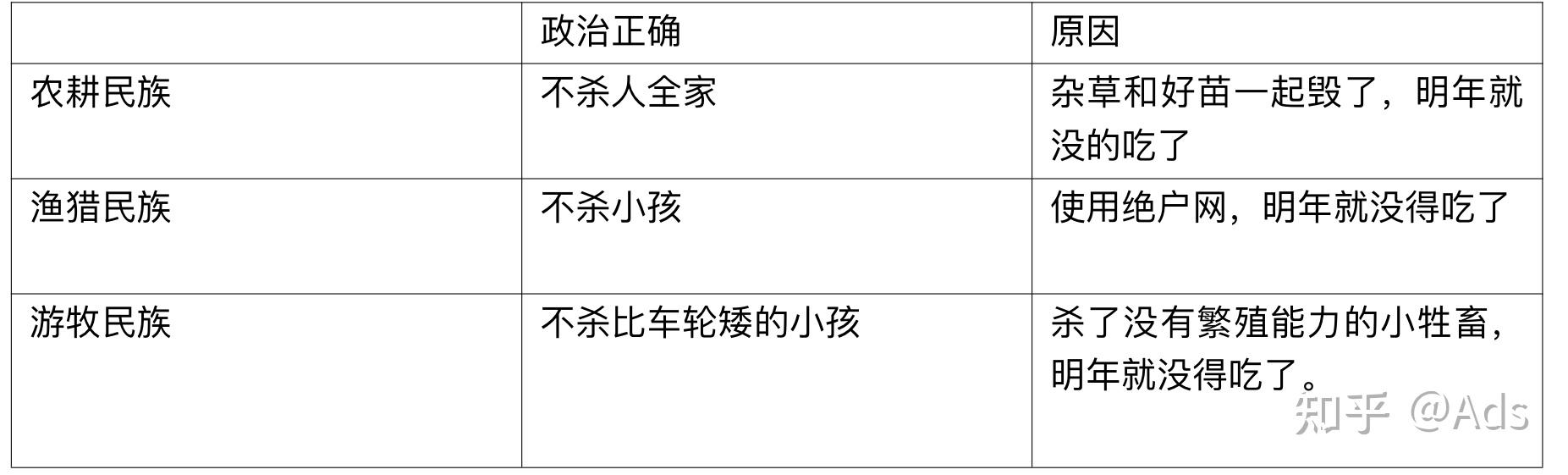 对于游牧民族则又不一样了,游牧民族的政治正确是“不杀比车轮矮的小孩”
