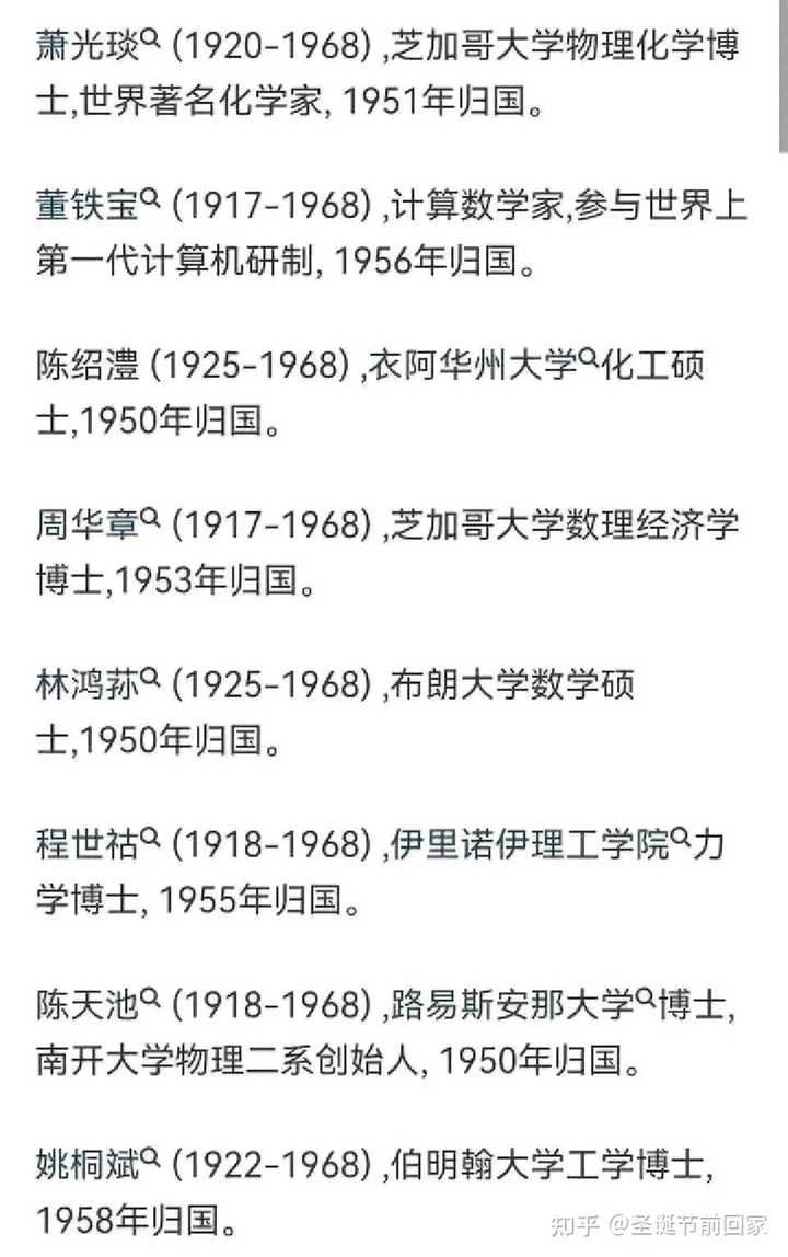 第二,50年代回国七八百位科学家,至六七十年代被折磨自杀八人(更早些回国的科学家被折磨死的更多,包括束星北、叶企孙等),被整废、整得无法工作、无法“为国作贡献”的占大部分。即便真的做出了贡献的、现在老宣扬的邓稼先、于敏、钱学森等几位,也多次被冲击、折磨,邓稼先虽然因杨振宁恰好回国、周总理顺势保住而幸免于难,但姐姐自杀、后代出国,于敏、钱学森也只能说是幸免于难。但赵九章、姚桐斌却惨死。折腾到改革开放前中国的物理学基本空白,从零开始,十多年前中国顶级高校的老教授谁能理解些国外大师写的教科书的要旨,教给学生,已经算得上很厉害了,差距就是这么大。