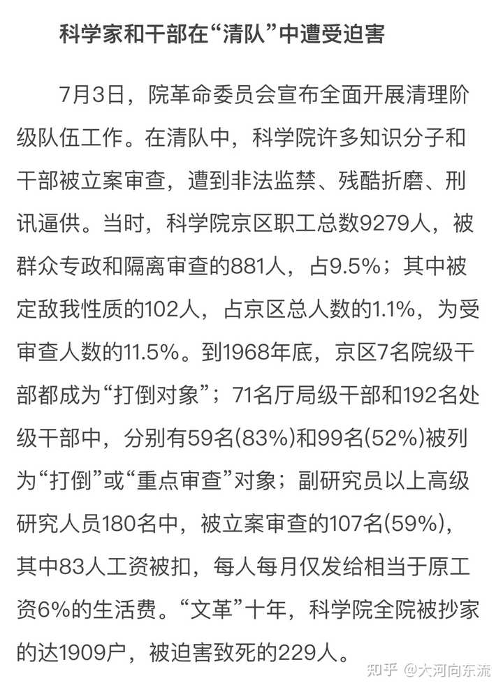 科学院许多知识分子和干部被立案审查,遭到非法监禁、残酷折磨、刑讯逼供。当时,科学院京区职工总数9279人,被群众专政和隔离审查的881人,占9.5%;其中被定敌我性质的102人,占京区总人数的1.1%,为受审查人数的11.5%。到1968年底,京区7名院级干部都成为“打倒对象”;71名厅局级干部和192名处级干部中,分别有59名(83%)和99名(52%)被列为“打倒”或“重点审查”对象;副研究员以上高级研究人员180名中,被立案审查的107名(59%),其中83人工资被扣,每人每月仅发给相当于原工资6%的生活费。“文革”十年,科学院全院被抄家的达1909户,被迫害致死的229人。
