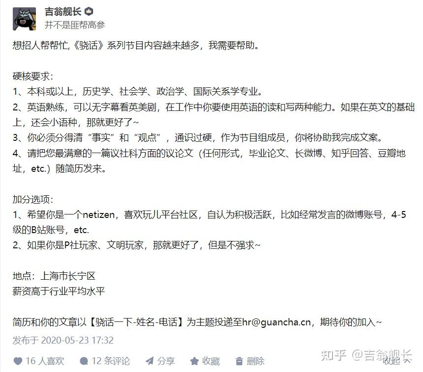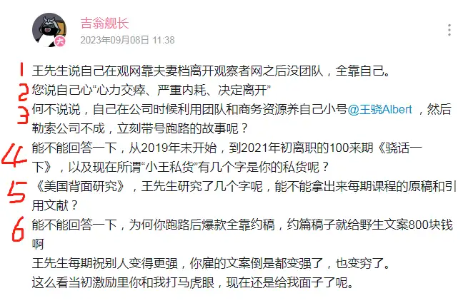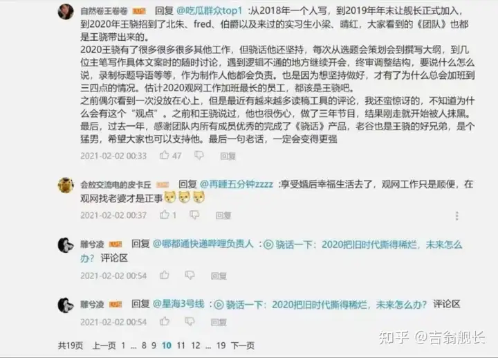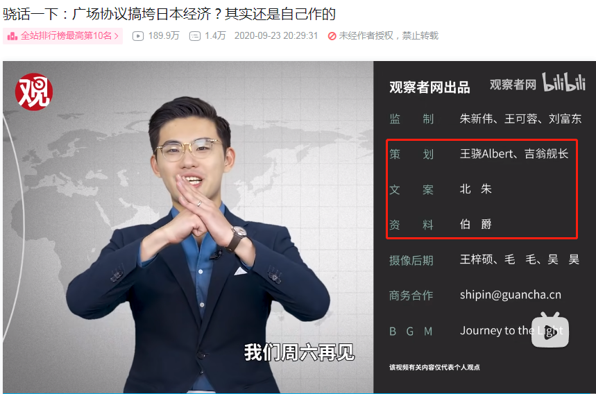 去翻了翻骁话一下的片尾,制作人员名单文案标的基本是王骁 吉翁舰长,两个人的主次关系不大清楚,我倾向于名字在前的是主导者。至于给自己的账号引流,我觉得没啥,观察者网的其他人多多少少也有。至于王骁和观察者网的事,以及单干后文案靠约稿,这些都是吉翁舰长的自述,真实性不好说。还是拿作品说话吧,总是搞一些有的没的真没意思。