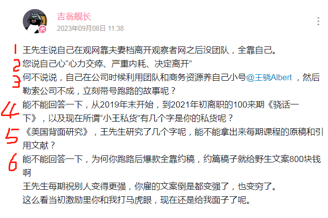 5、“《美国背面研究》,王先生研究了几个字呢,能不能拿出来每期课程的原稿和引用文献?”这一条指控也存在偷换概念的嫌疑。从网上截图的箭头标注可以看出《美国背面研究》是观察者网下的一个叫做“观察者网知识产品部”发布的一个产品,是公司的产品而不是个人自媒体作品。