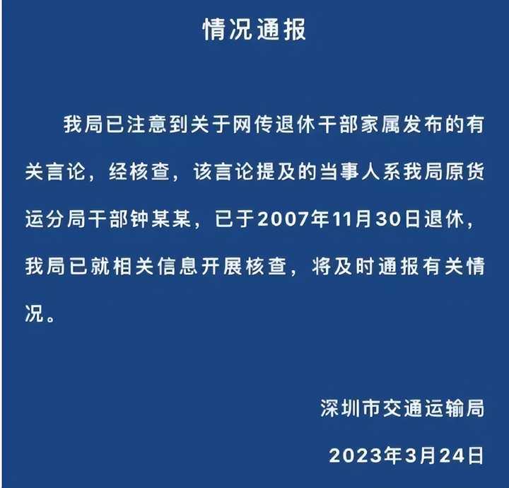 而深圳市交通运输局也发布公告表示,“将重启对分局干部钟某某的调查,随后会通报有关情况”。