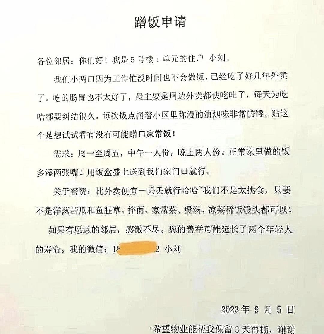 从小夫妻写的“蹭饭申请”可以看出,他俩不仅没觉得他们的这种要求满足起来是很麻烦的,还觉得这对给他们蹭饭的邻居来讲是占便宜的事情。因为在他们看来,这事就是邻居家平时做饭多放一点米,多加一点食材,就完事了,他们觉得对邻居来讲几乎没啥成本。但他们却愿意给邻居出钱,而且高达“仅仅”比外卖便宜一丢丢的钱!