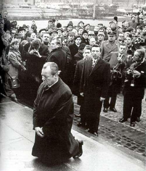 西德总理勃兰特(二战时的反纳粹斗士)在华沙遇难者纪念碑前跪下了,不需要下跪的他替所有应该跪但没有跪的人跪下了,跪下去的是勃兰特,站起来的是德意志