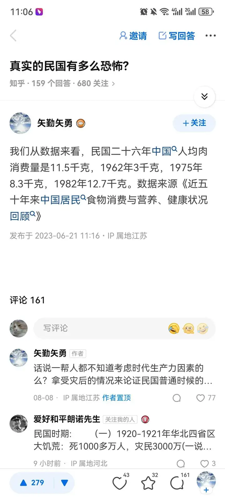 反共的需要罢了,如果民国坏,那中共推翻国民党岂不是众望所归?这是目田不能接受的。为了反共,就必须吹捧民国,比如这位,民国的人均肉消费量是新中国的好几倍,不知道的还以为是人肉呢。