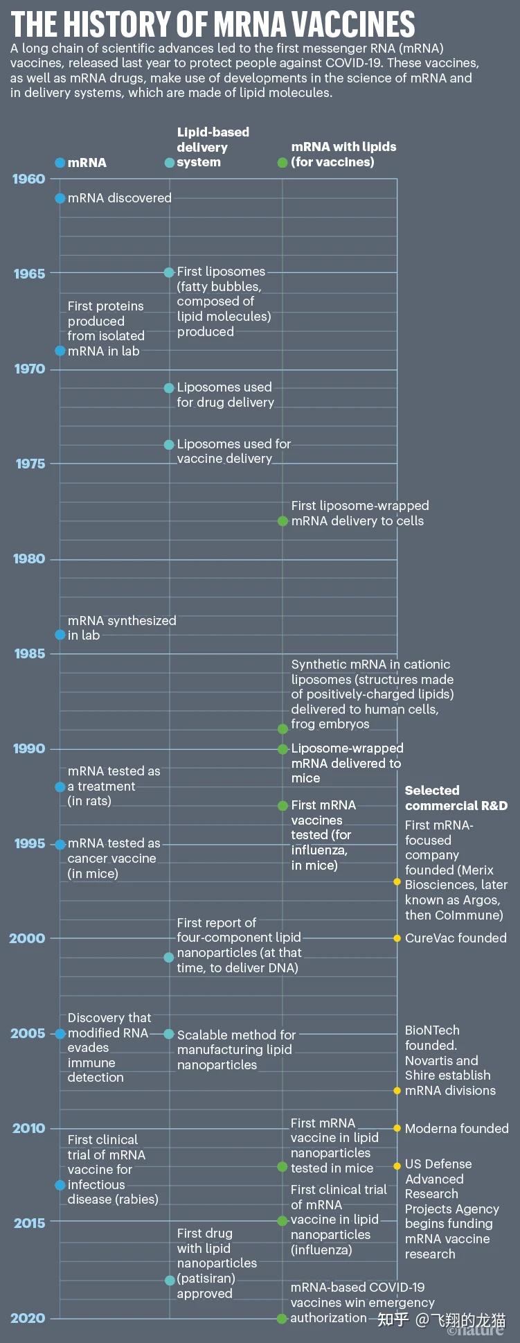 在缺乏使用修饰核苷酸和合适的递送系统情况下,这个mRNA疫苗的效果自然不会很好,抗原表达量低,副作用强,离真正的实际运用有着很大的距离。 关于mRNA疫苗的发展历史,可以参考下面这篇文章。非常有意思。mRNA疫苗的纠结历史 (nature.com)。这里仅作简单的介绍: