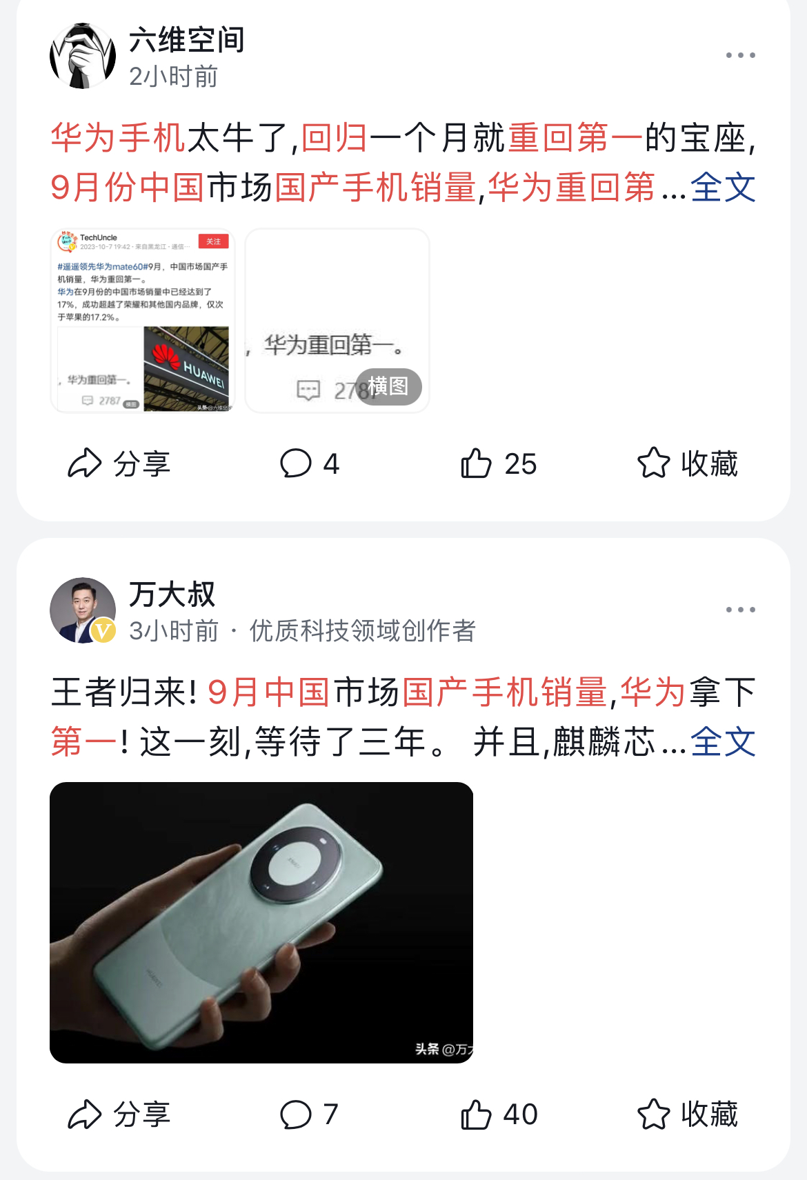 我搜了一圈,没看到权威数据说华为9月销量第一。只看到大量的氵冖转载“某菊王者归来”、“太牛了,第一”……