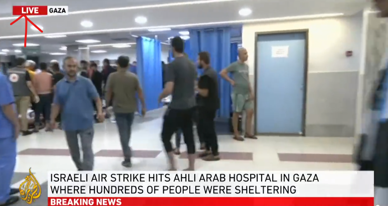半岛电视台最新消息:至少500人在以色列对加沙艾赫利浸信会医院的空袭中丧生。