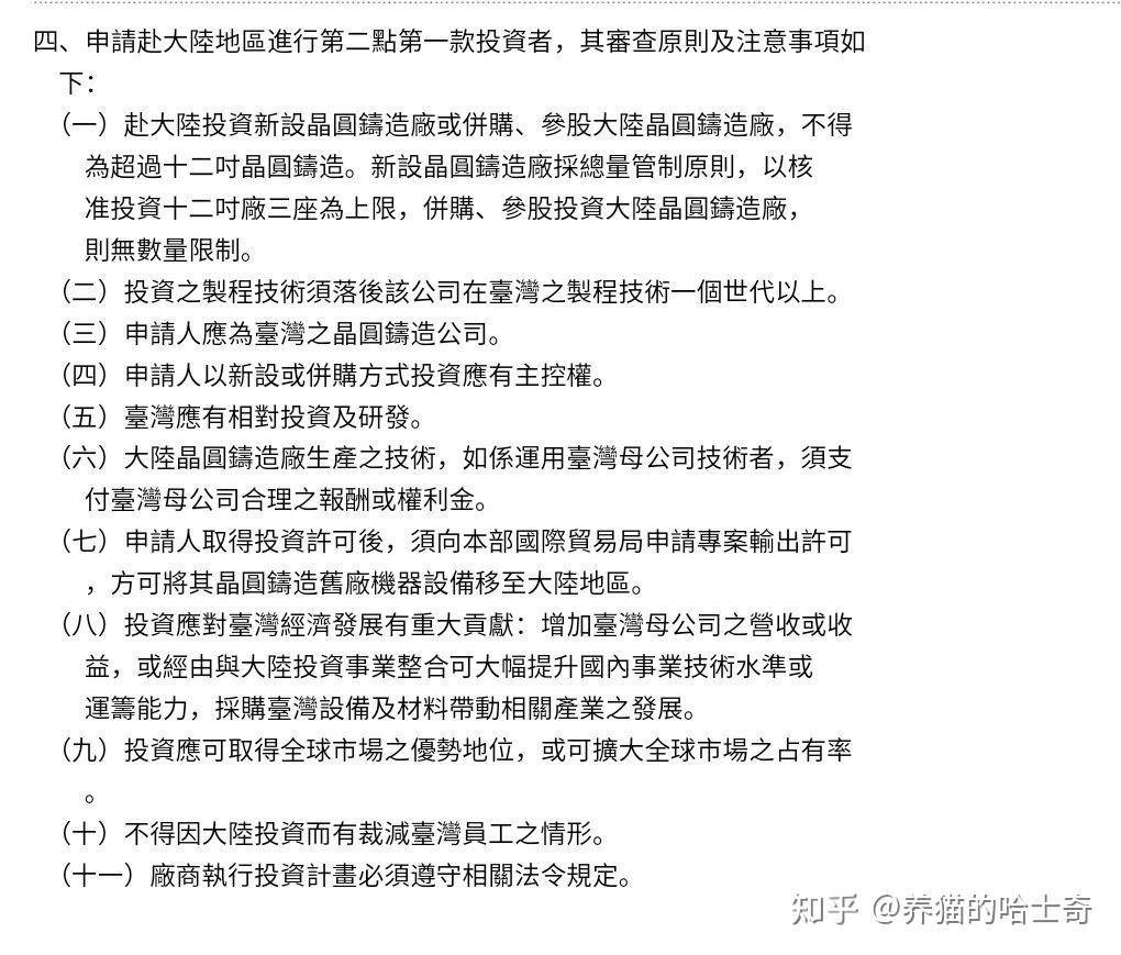 如果你往前追溯三十年,你会发现其实是中国大陆成就的郭台铭,成就的富士康,富士康也抓住了机会,当初很多比郭台铭厉害的台商因为各种原因措施了中国改革开放的红利。三十年前中国大陆必然开放,必然引进外资,台资、港资,这些年台湾也一直卡着台湾比较有优势的一些企业来中国大陆投资,比如台积电主动要求在大陆设厂,台湾当局有种种规定阻碍,比如台湾晶圆厂赴大陆投资制程技术必须落后该公司在台湾制程技术一个世代以上(具体规定见下图,注意这个政策只针对大陆),这还是2015年修改过的,之前是必须落后两个世代以上,这些规定适用于所有台湾晶圆厂和液晶显示器面板厂,所以曾经台湾领先大陆的面板、dram等产业都没能在大陆掀起波澜,最终是中国大陆自己的产业崛起。