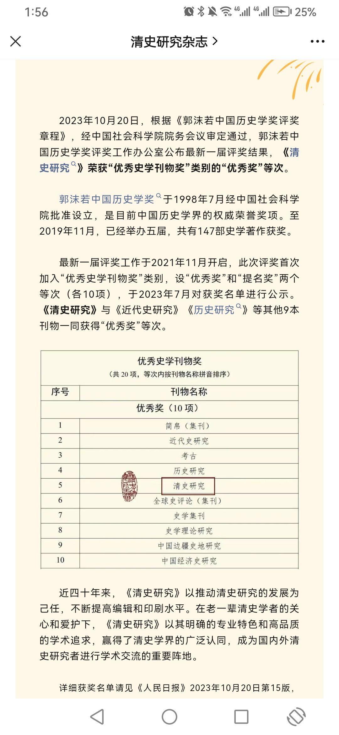 2023年10月20日,根据《郭沫若中国历史学奖评奖章程》,经中国社会科学院院务会议审定通过,郭沫若中国历史学奖评奖工作办公室公布最新一届评奖结果,《清史研究》荣获“优秀史学刊物奖”类别的“优秀奖”等次。