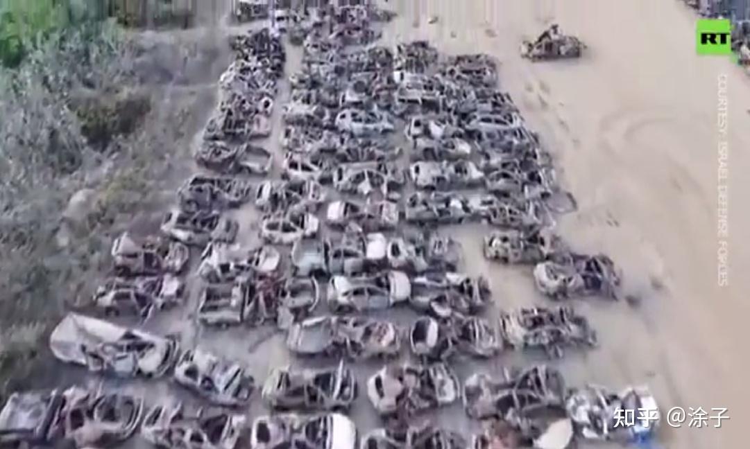 实际上这是以色列把音乐节屠杀后被焚烧的车辆堆在一起准备运出去。这些车的损毁情况也非常符合燃烧起火的模样,由于强烈燃烧车框架弯曲,最多有一些轻武器的射击,车的结构还能看得出来。