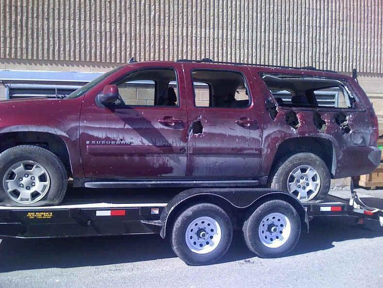 真实的被射击后的车辆损伤是什么样子的,美国警车早就“亲身”体验过了,被7.62*39子弹扫射过的警车模样: