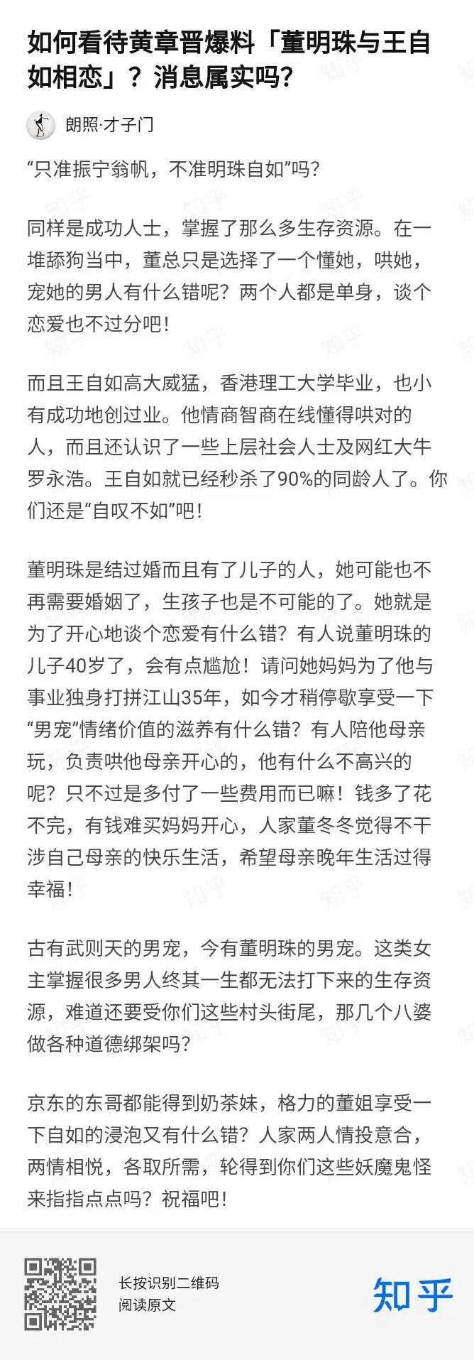王石娶了个小女友的时候,难道不知道会毁了一世英名吗?所以,董小姐这种高端人士,什么样的人没有经历过,只是再优秀的人,也有软肋,需要一定的情绪价值,而70岁的女人,谈一段黄昏恋有什么不行?虽然我不耻这样的软饭男,但是我觉得董小姐包个小奶狗没什么可批判的,当然,金星可能在Judge这不是条小奶狗,怕别人引狼入室。