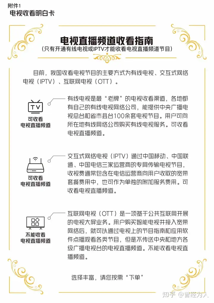 其实我们国家现在有4种合法合规的收看直接电视的方法,后两种免费的方法在“电视收看明白卡”中没有说明。