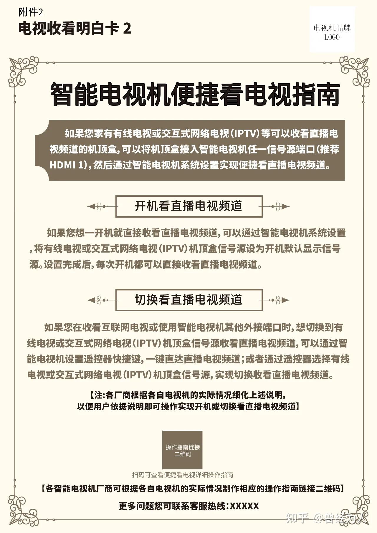 根据治理电视“套娃”收费和操作复杂工作部署要求,国家广播电视总局、工业和信息化部、国家市场监督管理总局、中国消费者协会决定开展电视收看“明白卡”提示工作。自2023年11月起,各电视机生产厂商要将制作完成的《电视收看“明白卡”》装入电视机包装箱内的说明材料中,同时在电商销售页面、线下实体销售和厂商入户安装电视机过程中,将“明白卡”内容向用户明确展示,并告知用户只有开通有线电视或IPTV方可收看电视直播频道节目。