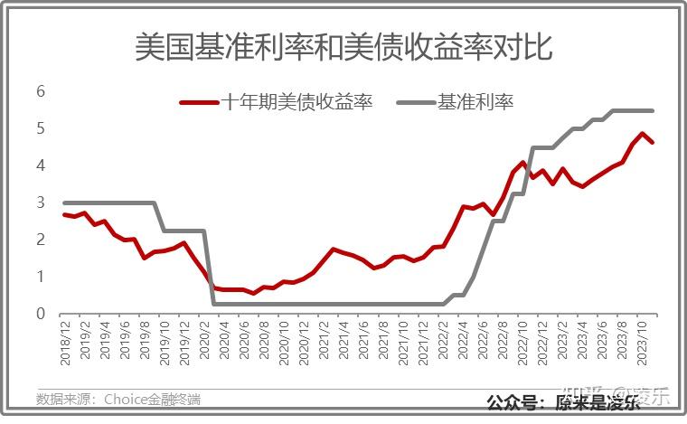 我用两张图你就能感受到CPI的重要性,下图我对比了美国基准利率和十年期美债收益率的关系,能够明显感觉到,十年期美债收益率是跟随基准利率在波动的,这个基准利率其实就是美联储的加息。