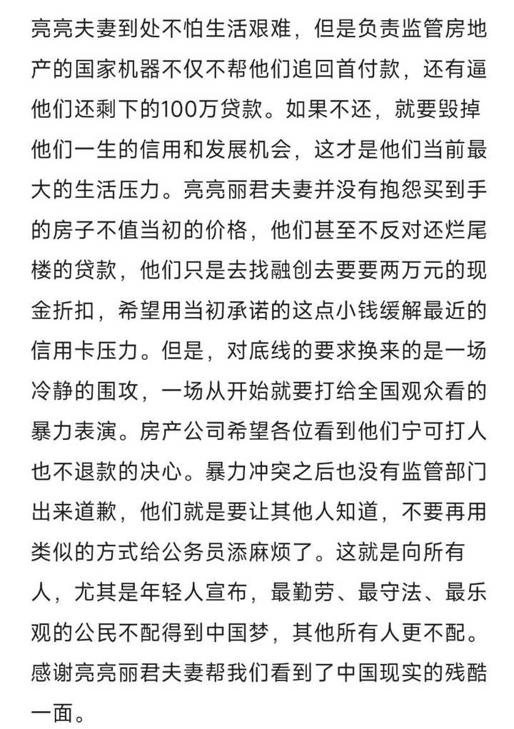 而中国融创,可谓是把无耻与卑鄙发挥的淋漓尽致,都说资本家是万恶之源,购房者依据购房合同支付了对应的费用,作为房地产商则必须按合同履行交付责任。中国融创未履行合同责任在前,面对亮亮丽君夫妻的维权,却以拳脚相对。中国融创不像是一个房地产商更像是一个涉黑组织。即便在整个社会都在关注着这对年轻夫妻的故事,中国融创却依然安然无恙的摆平了。真可谓是权力滔天。无疑,中国融创,你们战胜了亮亮丽君夫妻,你们在中国法制社会的建设之路中,留下了浓墨重彩的一笔,可耻并且可恨。