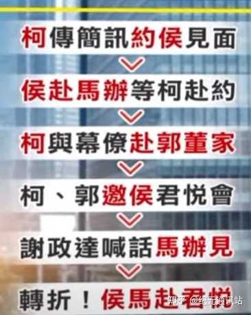 11月15日 四人于马办内达成六项协议 2. 让双方(实际上是三方)纠结僵持了半天的会面地点其实大有玄机,候朱坚持在马英九办公室(下称马办)会面,而柯郭先是邀请候前往郭府,后将地点改至台北市君悦酒店(君悦或成最大赢家...郭在记者会上多次提到2538号房更是经典)。