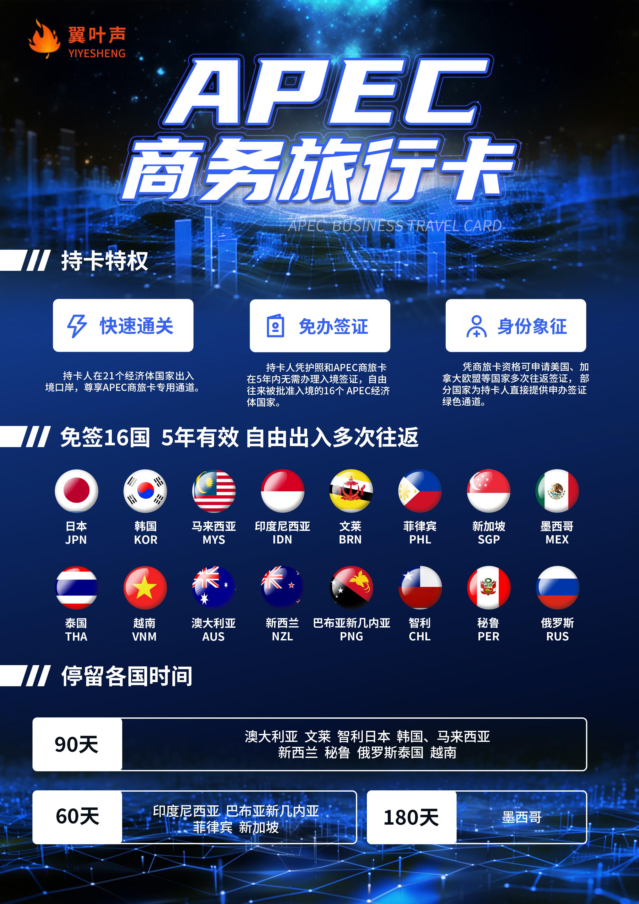 APEC商务旅行卡(ABTC)计划旨在为商务人士进入APEC经济体提供便利。通过简化流程,APEC卡持有人将能够避开繁琐程序,能快些进入APEC成员的经济体:澳大利亚、新西兰、日本、韩国、新加坡、马来西亚、泰国、菲律宾、文莱、智利、印度尼西亚、墨西哥、秘鲁、巴布亚新几内亚、俄罗斯、越南。