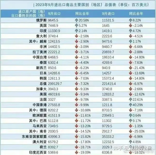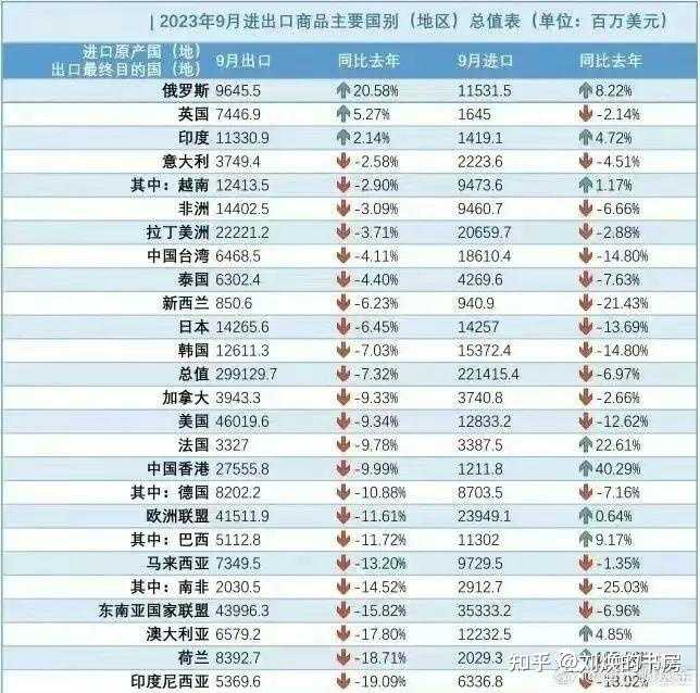 当然了,这是9月份的进出口总额,这是一个月,全年的我也没找到,我们主要的顺差还是来自于美国,尽管已经掉落到美国第四大贸易伙伴了,所以今年出口有点困难,我们最大的进出口伙伴还是东盟。