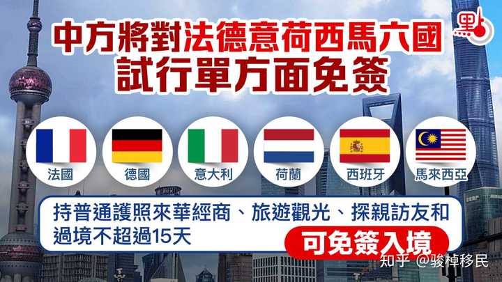 11月24日,外交部发言人毛宁宣布,将对法国、德国、意大利、荷兰、西班牙、马来西亚6个国家持普通护照人员试行单方面免签政策,从下个月开始实行免签政策,为期一年(2023/12/01~2024/11/30),上述国家公民可访华/过境不超过15天。