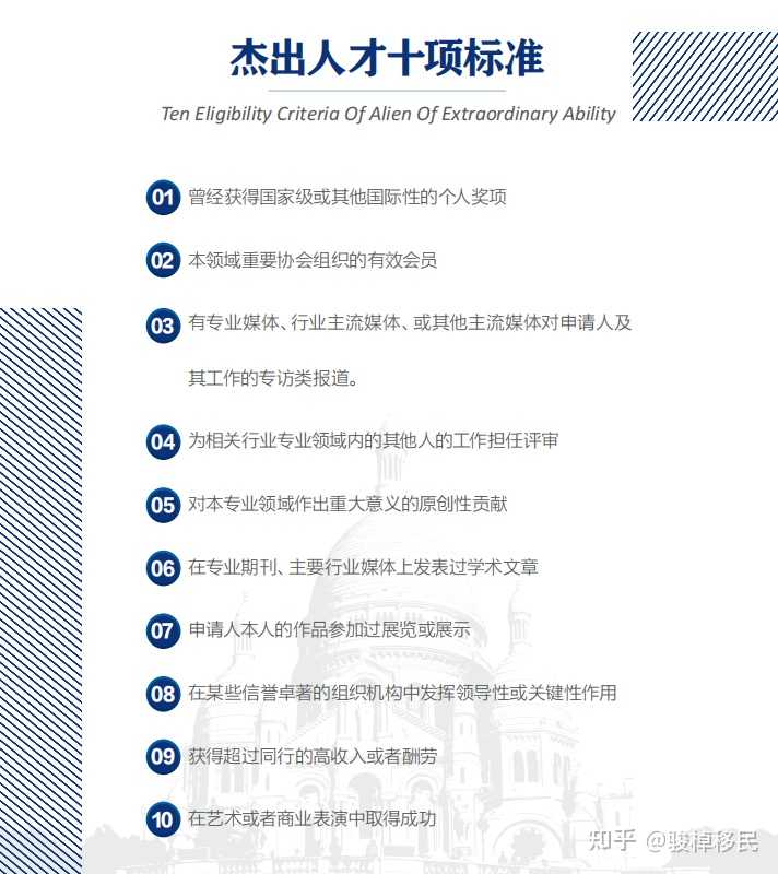 满足以下十条标准中的任意三项及以上,来证明在某一专业领域内的杰出能力与成就,即“十选三”标准,即可申请。来源:骏棹移民