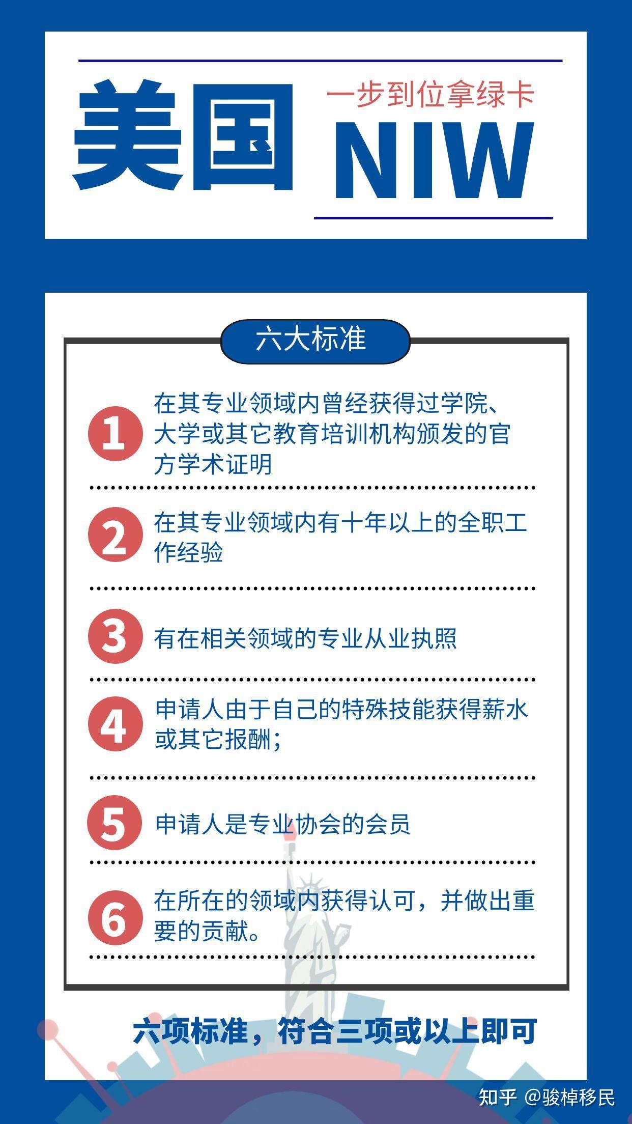美国移民局规定,在规定的领域内(科学、艺术、商业领域)拥有特殊技能,满足要求中的六项标准中的三个,能够提供书面证明材料,也可以申请NIW。来源:骏棹移民