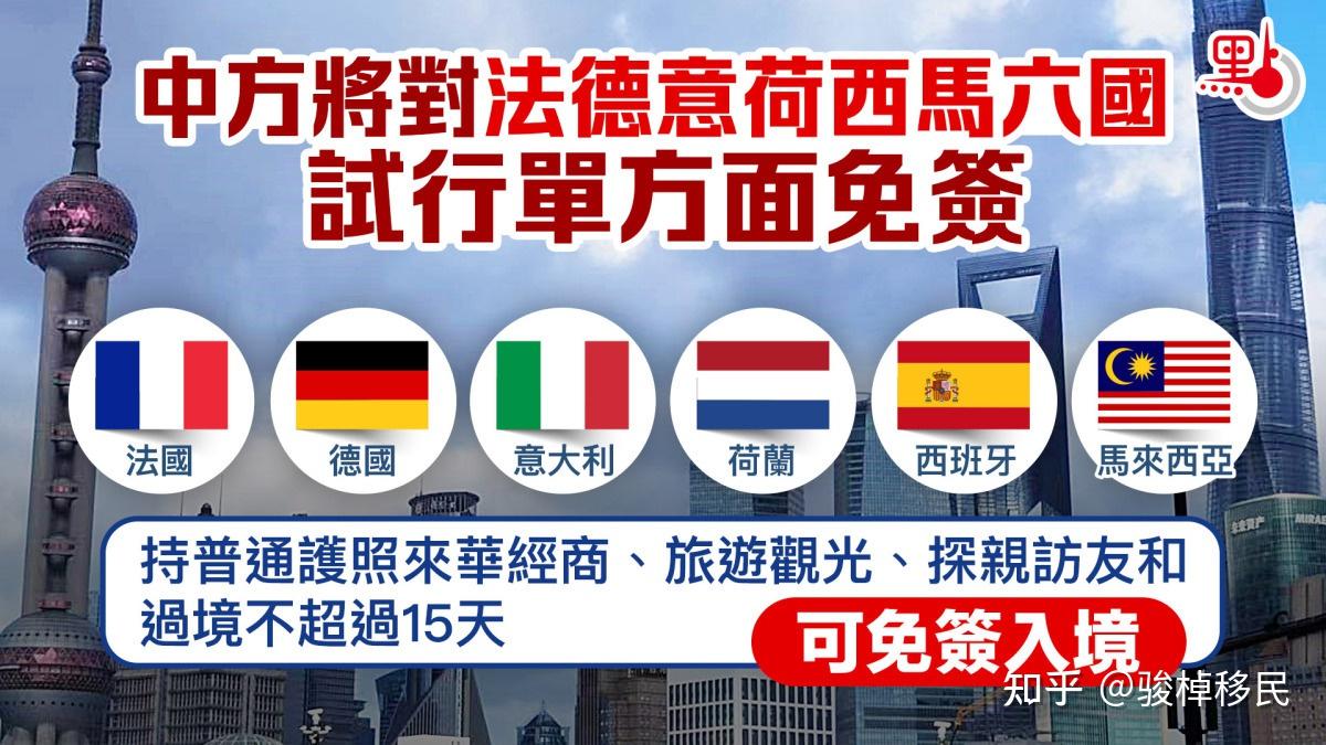11月24日,外交部发言人毛宁宣布,将对法国、德国、意大利、荷兰、西班牙、马来西亚6个国家持普通护照人员试行单方面免签政策,从下个月开始实行免签政策,为期一年(2023/12/01~2024/11/30),上述国家公民可访华/过境不超过15天。