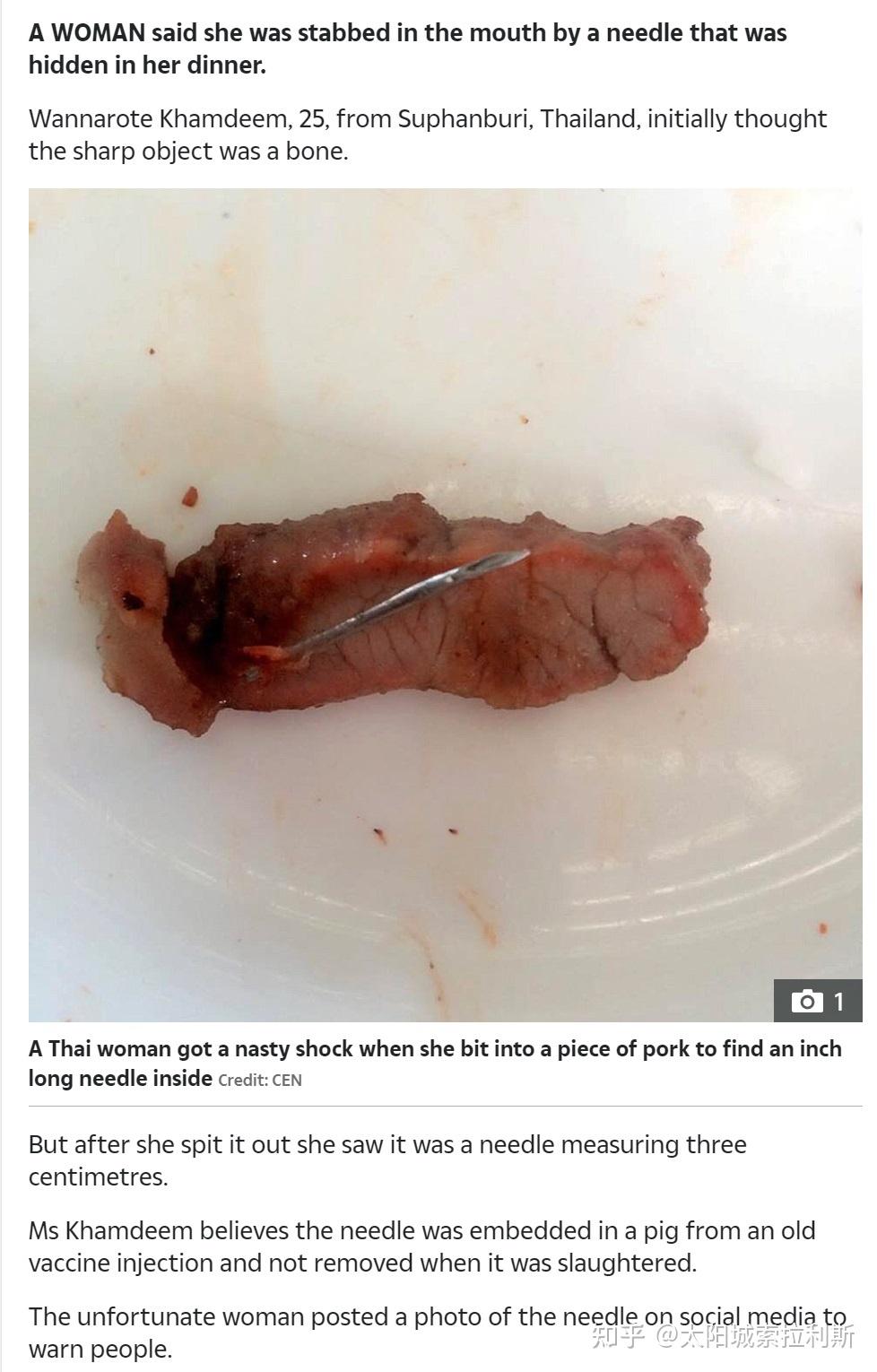 25岁的Wannarote Khamdeem来自泰国素万武里,最初认为这个尖锐的物体是一块骨头。但当她吐出来后,她看到那是一根三厘米长的针。Khamdeem女士认为,针头是从旧疫苗注射中嵌入猪体内的,在屠宰时没有取出。这名不幸的女子在社交媒体上发布了一张针头的照片,以警告人们。