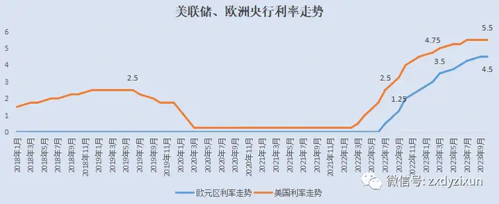 截止到2023年10月美国、欧洲央行利率分别为5.5%、4.5%,央行基准利率均高于当月CPI数值2.3%、0.9%,欧美央行已经失去了继续加息的理由,只需要静待通胀继续回落即可。