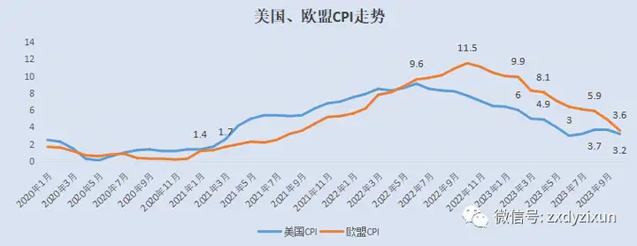 10月美国、欧盟CPI同比上涨3.2%、3.6%,6月美国CPI回落至3%后,在美联储的操作下,美国CPI横盘了将近4个月,再次回落至3%附近,预示着通胀终于告一段了。