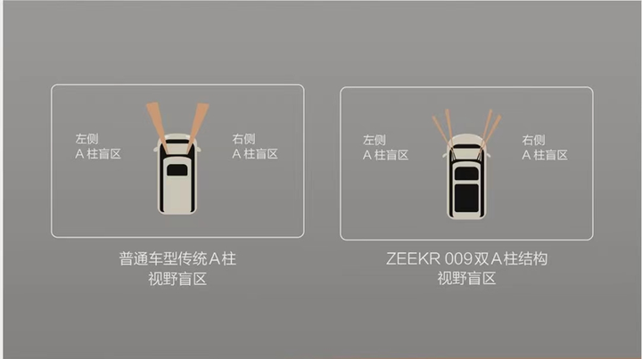 汽车的很多设计都是矛盾的,比如MPV的大空间需要更高的车身,风阻系数就难以保证。为了降低风阻系数,极氪009采用了超大的空气动力学静音风挡玻璃,倾斜角度很大,如果采用传统单A柱设计,会造成A柱倾斜角度太大,承重点太靠前,车头吸能和抗顶压能力都会很弱。