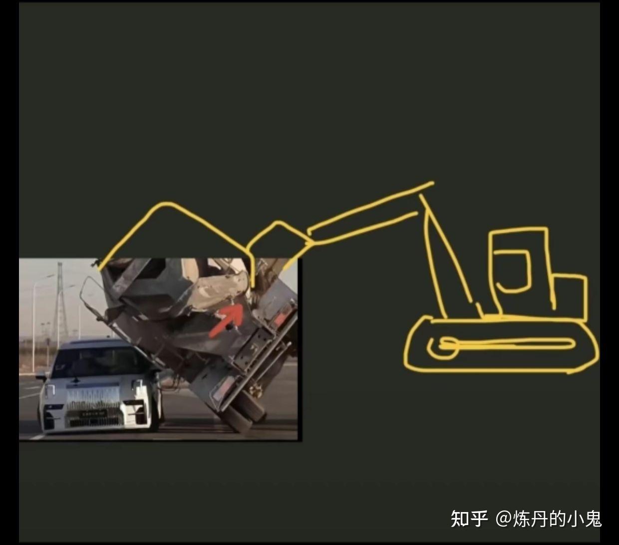 因此可以根据目测角度和简单的物理受力原理推测出,压在极氪汽车顶的总压力在1到5吨左右(具体倾斜角度无法准确估算出,上面算例是按照不利的重心偏高假设,按照实际重心低于2米考虑时,支撑力会更小),远不是混凝土罐车总重的30吨。