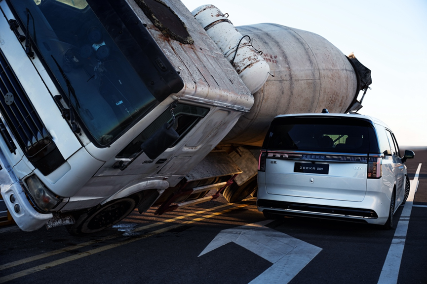 凝土搅拌车在行驶时需要不断搅拌,会对自身的重心产生偏离,侧翻的风险很高。这次混凝土搅拌车的顶压测试,给了极氪009车顶抗压能力一次良好的展现机会。极氪009在这次顶压测试中,被通过单边桥爬坡侧翻的搅拌车直接压顶,碰撞瞬间车顶与罐体的接触面积小,罐体侧翻下压角速度快,瞬间压强非常高。可见搅拌车的质量大、体积小、高度高等特点,下压的伤害性甚至超过了装满货物的半挂车。可以说这样的测试几乎已经达到了车辆事故危险性的极限。通过在ABCD柱采用高强度钢,极氪009 的车顶最大承载能力达到了13吨,相当于将近自身体重的5倍。在测试中,用事实证明了自身13吨顶压能力不是吹出来的,是实实在在的实力。